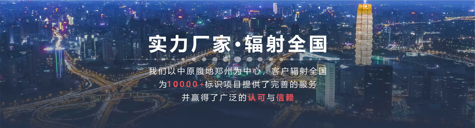總公司位于河南鄭州廣告創(chuàng)意產(chǎn)業(yè)園A區(qū)1排1號(hào),工廠位于美麗的黃河北岸占地面積超過12000平米,全套現(xiàn)代化生產(chǎn)設(shè)備,集現(xiàn)場(chǎng)勘查、設(shè)計(jì)、研發(fā)、生產(chǎn)定制服務(wù)為一體的標(biāo)識(shí)標(biāo)牌加工型企業(yè)。擁有100多個(gè)品類產(chǎn)品,成功為國內(nèi)3000多家企業(yè)單位提供服務(wù),口碑享譽(yù)業(yè)內(nèi)。